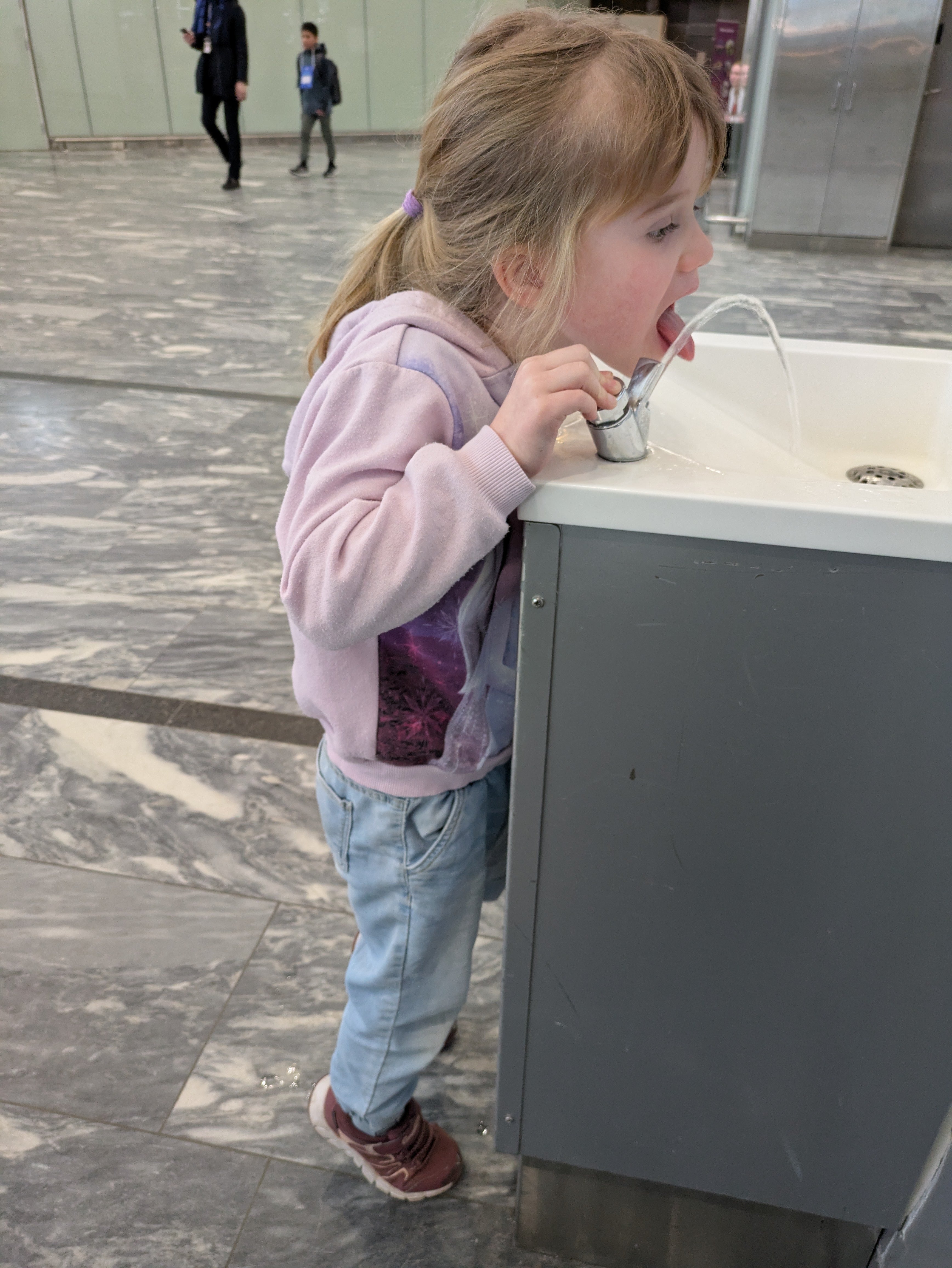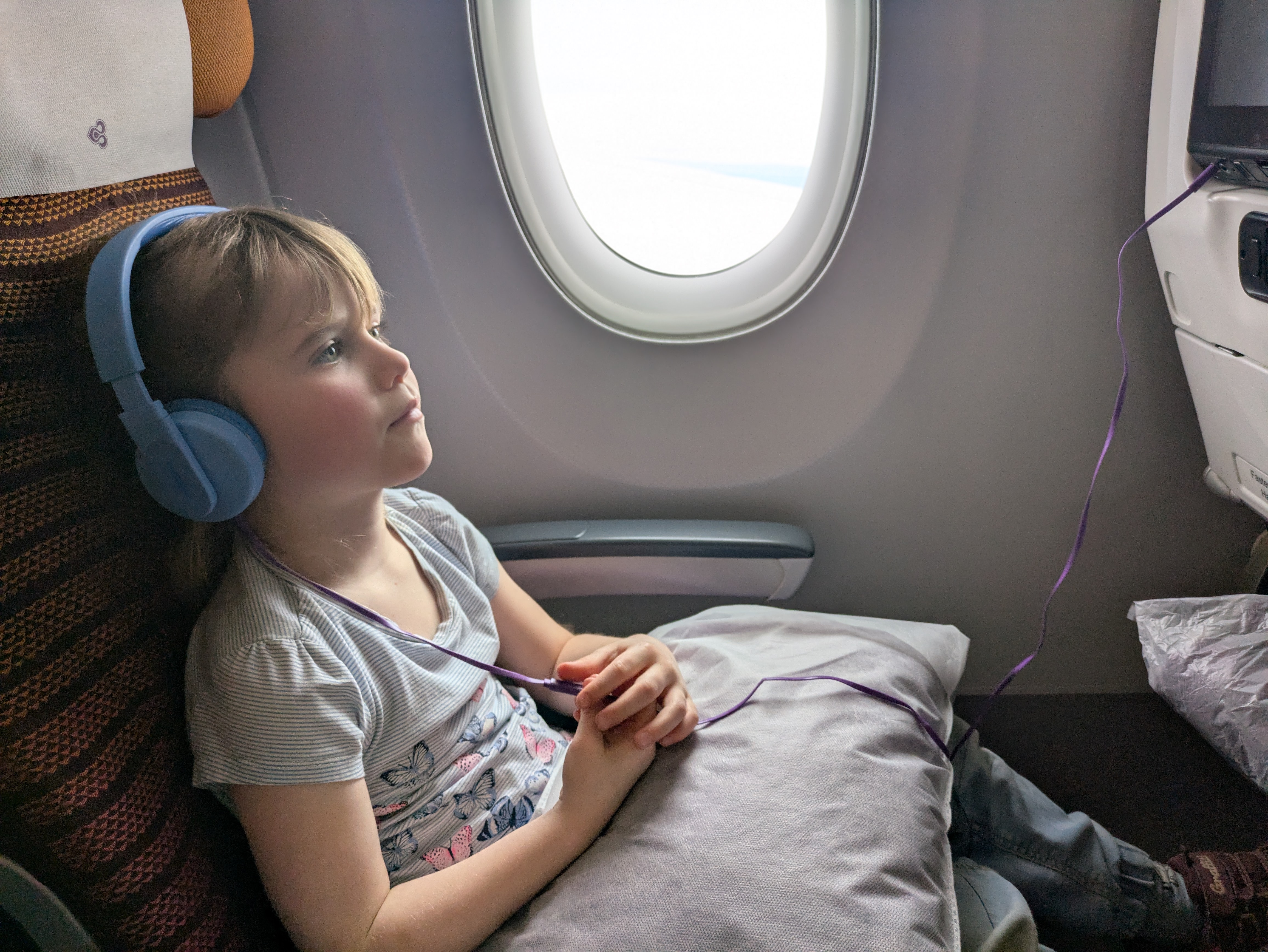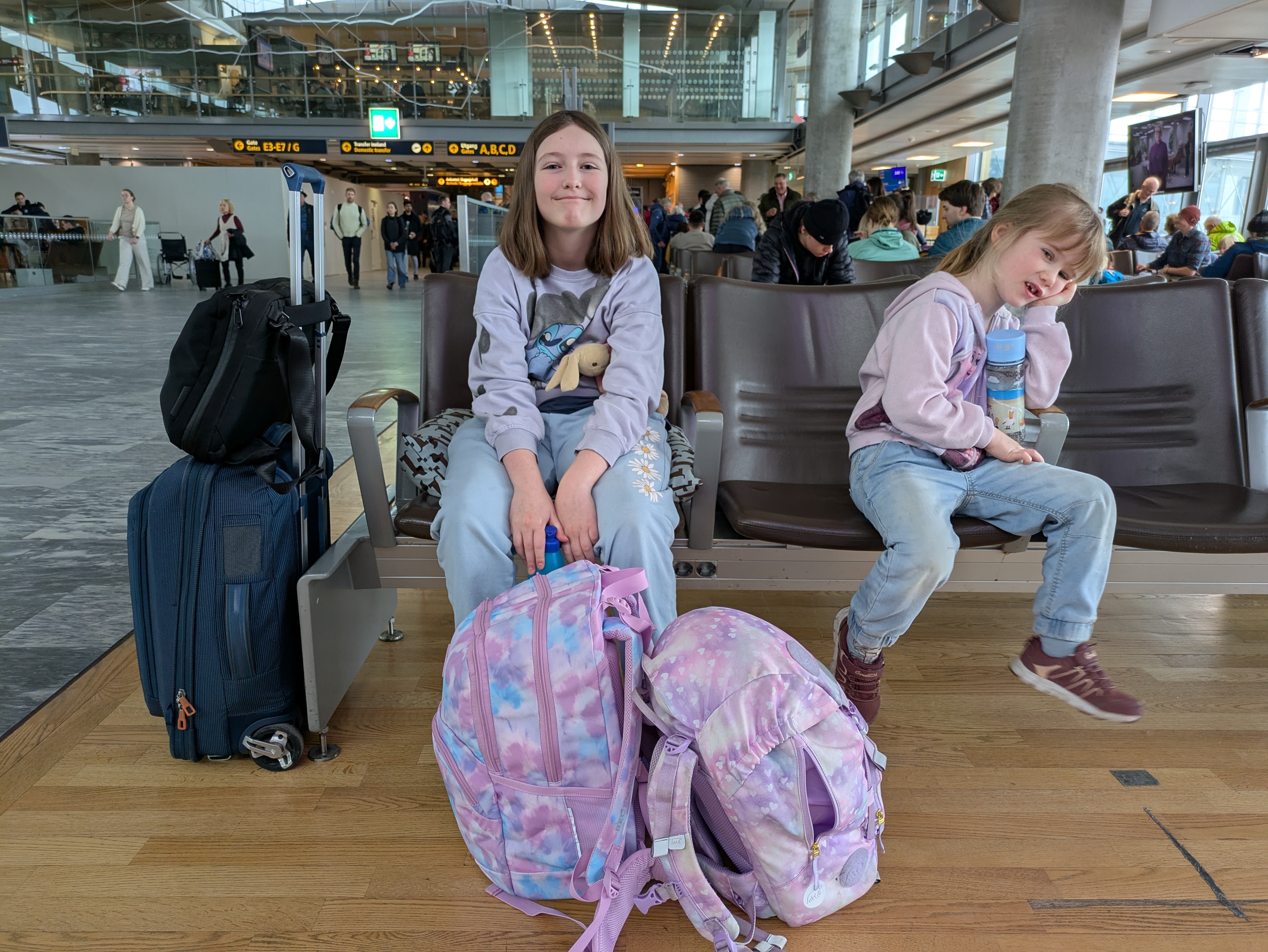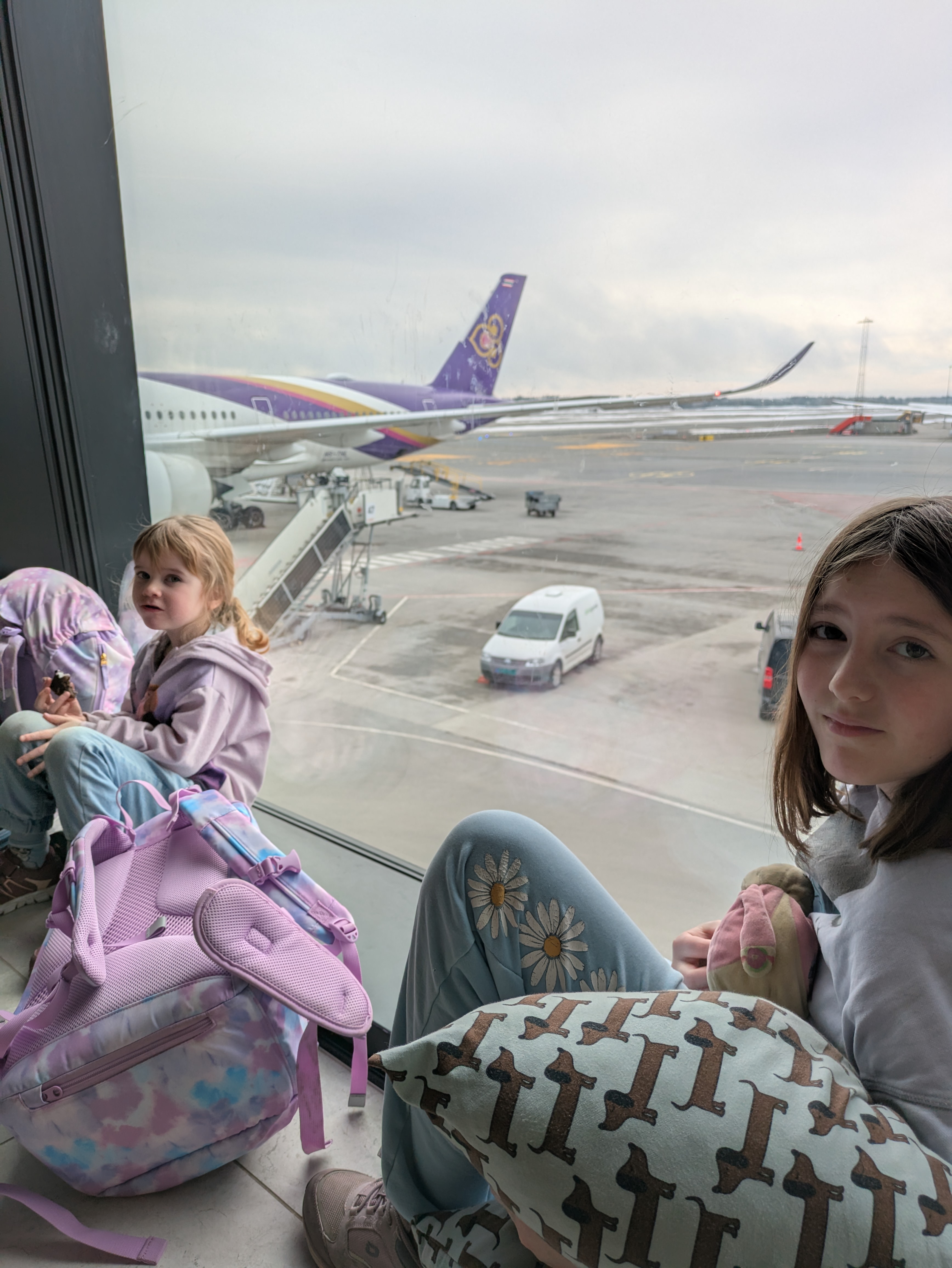 Going halfway around the world is far. But the flight path from Oslo’s main airport, Gardermoen, is actually not that bad. Just one connection in Bangkok. But that means two flights of around 10 hours each. My father was kind enough to drive us to the airport and help us inside with our luggage. The drive went smoothly although Isabelle does get horribly car sick. Thankfully we know this and we come prepared. Two throw up bags were tossed in the garbage when we parked. Check-in went as well as can be expected. There was a tour group in front of us that made it a bit of a wait, but once they got going it was a breeze. We concluded that travel is mostly just waiting. Waiting to check-in. Waiting to go through security. Waiting to pre-board your flight. Waiting to board the flight. And finally, waiting to take off. Oh, and currently we are waiting in the Bangkok airport for our next flight.