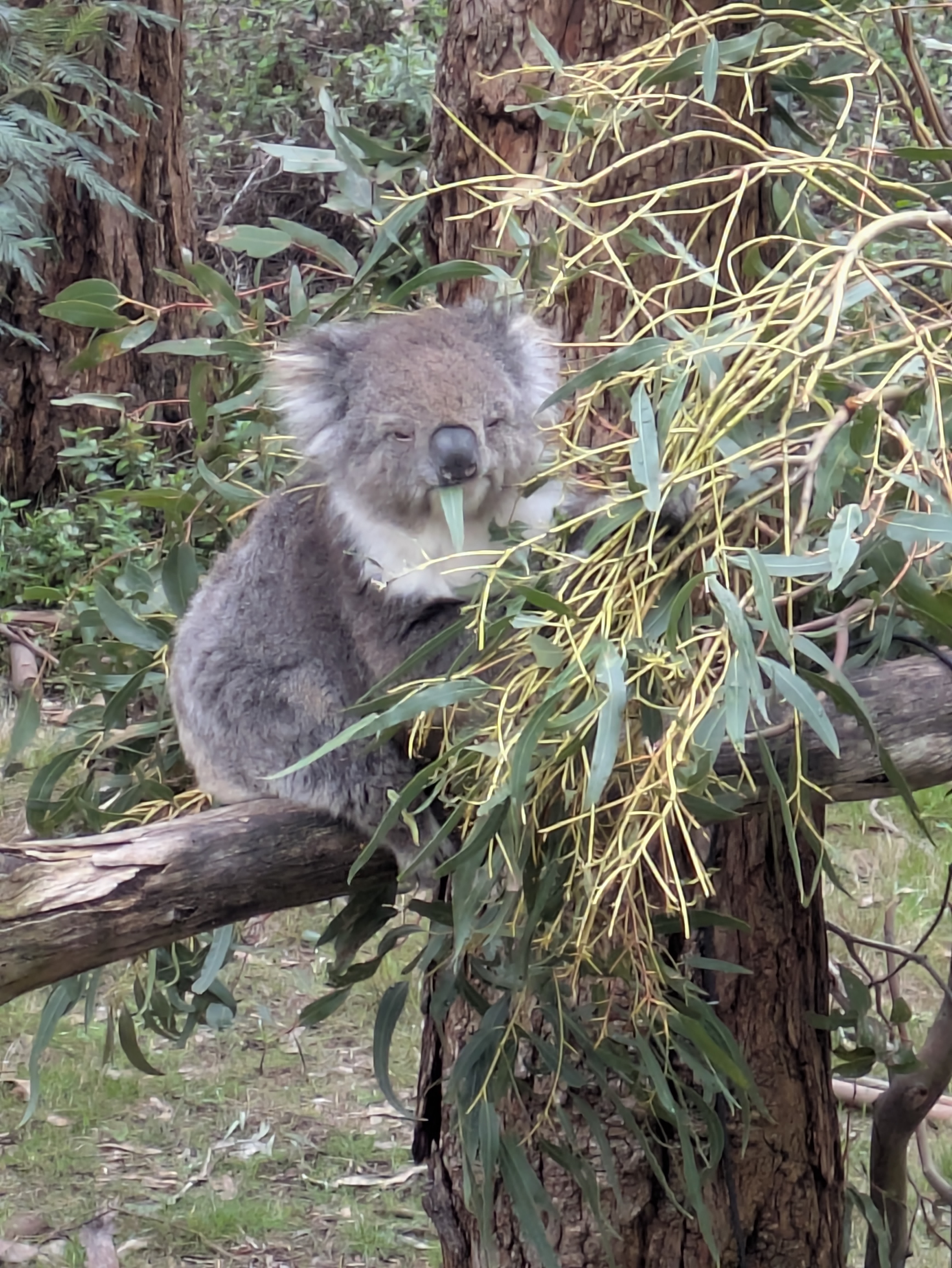 Heading down to Phillip Island on Thursday evening, we had waited till the kids were done with school for the day. And seeing as our tickets for the penguin parade were on Saturday we decided the Koala Reserve was a good place to start. It also happened to be just up the road from our accommodation. Mind you, Phillip Island is not very big so nothing is really that far away from anything. The Koala Reserve is as the name suggests, a reserve for Koalas. Some Koalas are rescues from bush fires, others are just displaced due to human activities (deforestation). But as the Visit Victoria website put it: “…elevated boardwalks bring you closer to the koalas as they go about their daily business of sleeping, eating, and sleeping some more.” So lots of sleeping Koalas or, if not asleep, eating. There was one guy who actually walked along a branch as we watched so they do move. At least every now and then. In general it was a better experience then seeing Koalas at the zoo. These are wild Koalas after all and the habitat is left as natural as possible. Minus the board walks of course. There was also at least one Wallaby and some birds that I don’t remember the species of. Basically they tend for indigenous animal that needs looking after for whatever reason. So definitely a good start to our trip!